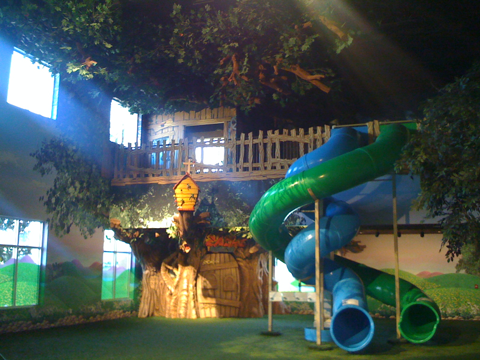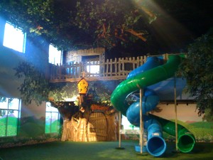 The idea of pulling an outdoor park into our new indoor facility became a huge win! We constructed a two-story tree house with a staircase that allows kids to “climb” the tree and come down one of two tube slides.